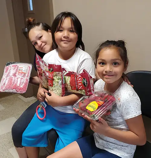 Cora with 8-year-old twins Karter and Genah on a recent visit to a food pantry supplied by the Great Plains Food Bank.