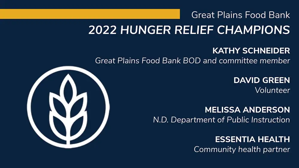 FARGO, N.D. – The Great Plains Food Bank has announced Kathy Schneider (Great Plains Food Bank Board of Directors), David Green (volunteer), Melissa Anderson (N.D. Department of Public Instruction) and Essentia Health (community health partner) as its 2022 Hunger Relief Champion Award winners. Each individual and organization have made an exceptional commitment to battling food insecurity inside their communities and have been longstanding champions in the fight to end hunger across North Dakota and Clay County, Minn.