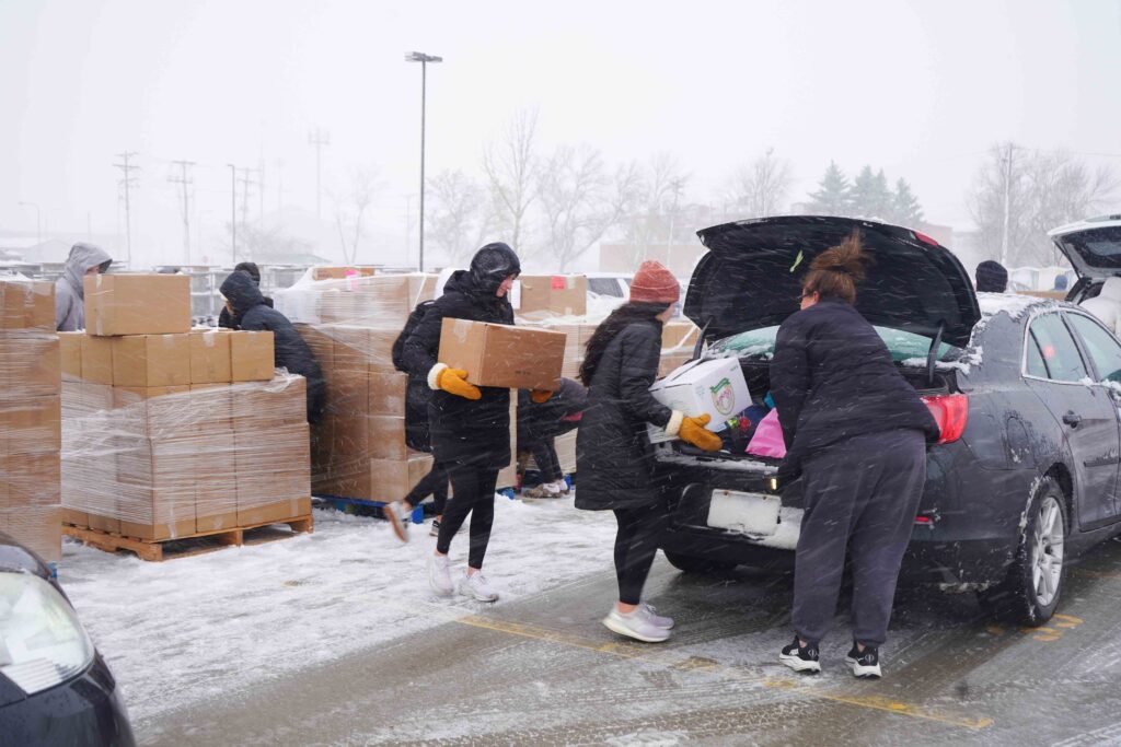 This past year, with individuals and families experiencing heightened need, students took their impact one step further. Food collected through Fill the Dome was distributed directly to the community through a drive-through food distribution, where more than 1,420 boxes of food were given out to nearly 475 families. Each family received three boxes of groceries, along with diapers and hygiene products as needed. Additional food went to the Great Plains Food Bank to be distributed to their partner food pantries and local school pantries.